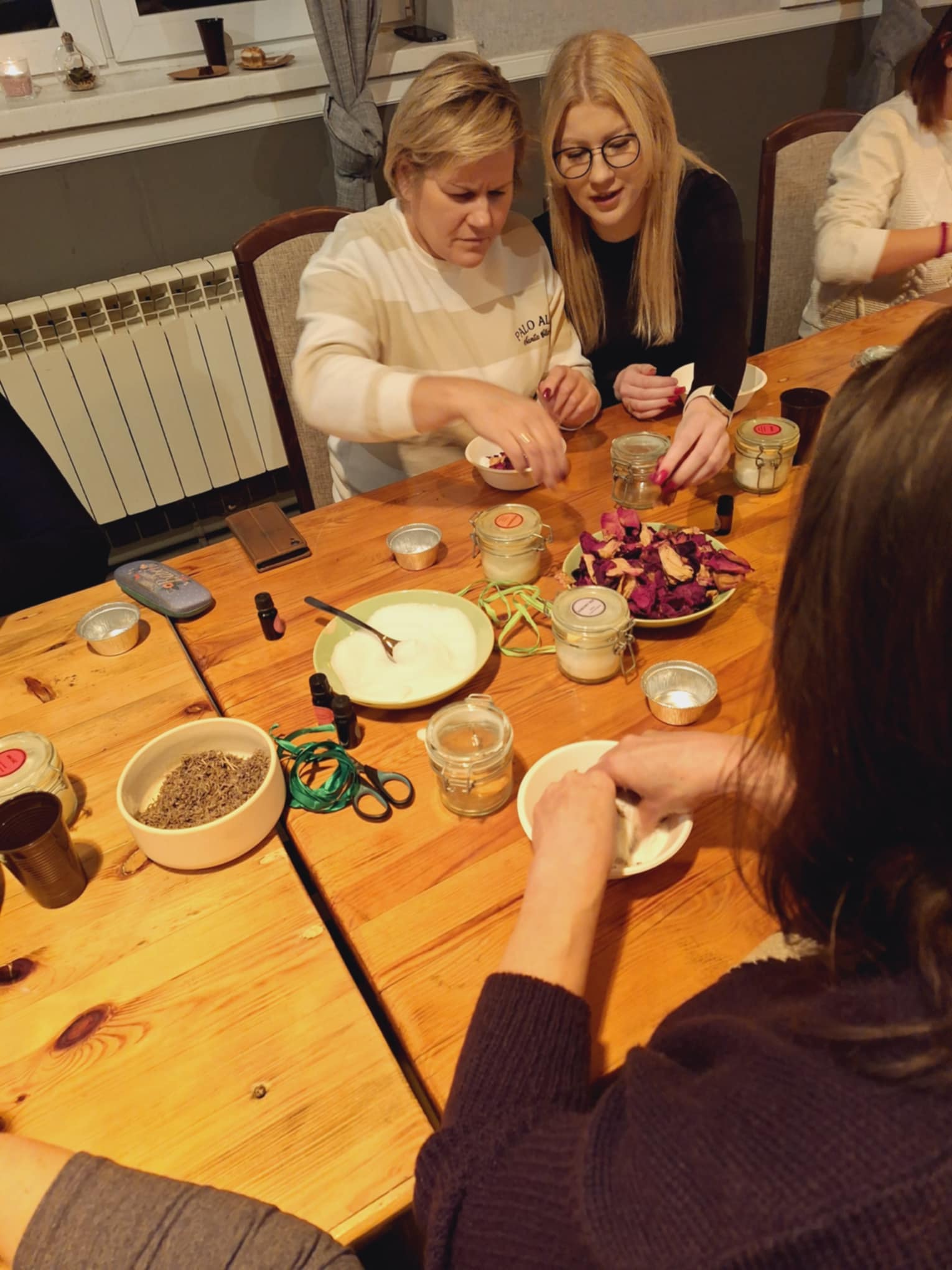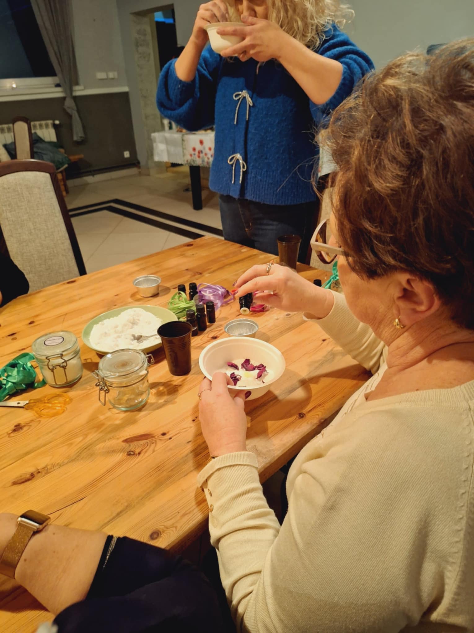 Na zakończenie, wszystkie wytworzone kosmetyki zostały zapakowane w foremki lub słoiczki, udekorowane płatkami kwiatów i przygotowane jako prezenty dla najbliższych. Warsztaty były nie tylko okazją do nauki, ale także do spędzenia czasu w miłej atmosferze i wymiany doświadczeń.